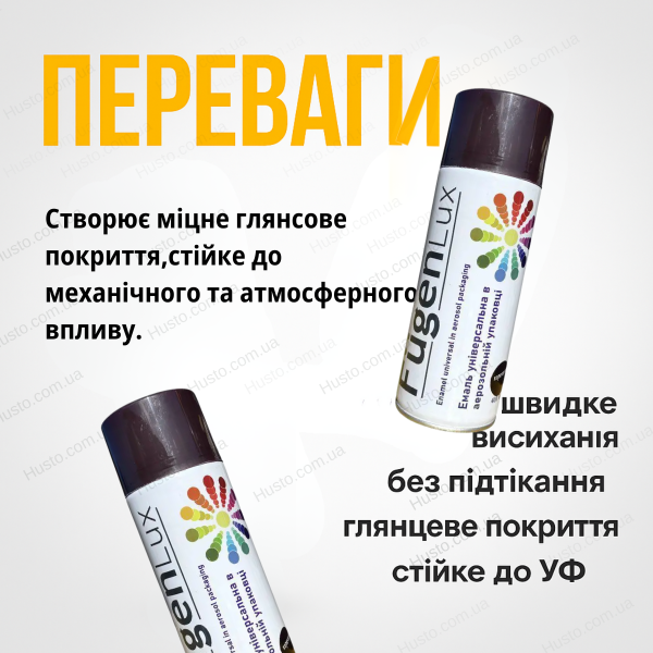 Швидко оновіть будь-яку пластикову, дерев'яну чи металеву поверхню насиченим коричневим кольором: аерозольна емаль «Fügenlux» утворює рівномірне покриття без патьоків і надовго зберігає яскравість.