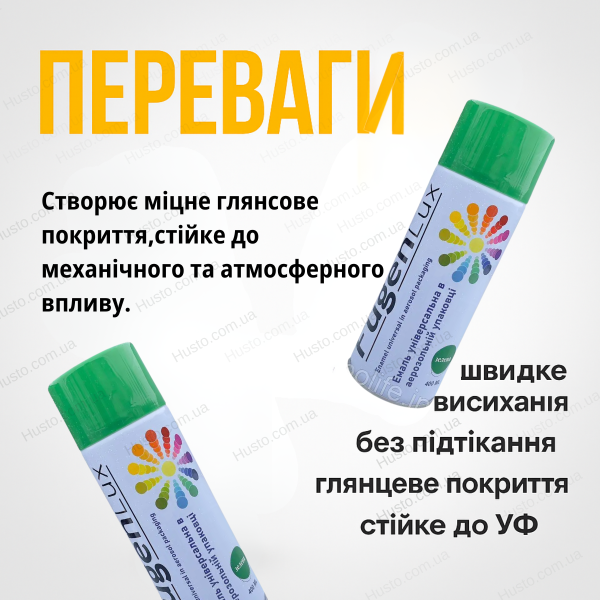 Швидковисихайна аерозольна фарба, що одним рухом оновлює пластик, дерево й метал, залишаючи насичений зелений колір без потьоків чи втрати яскравості.