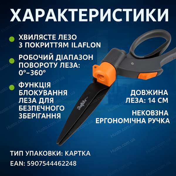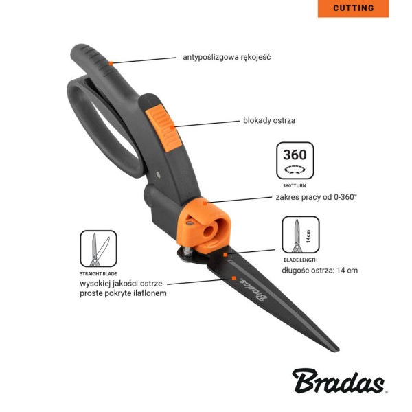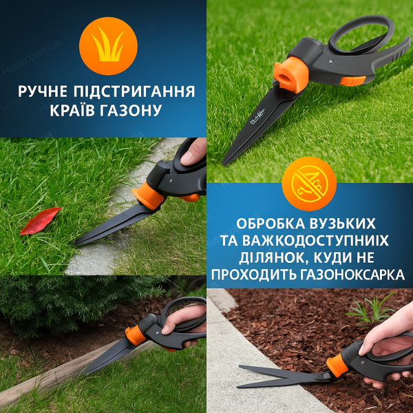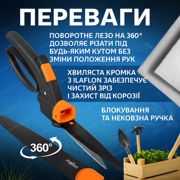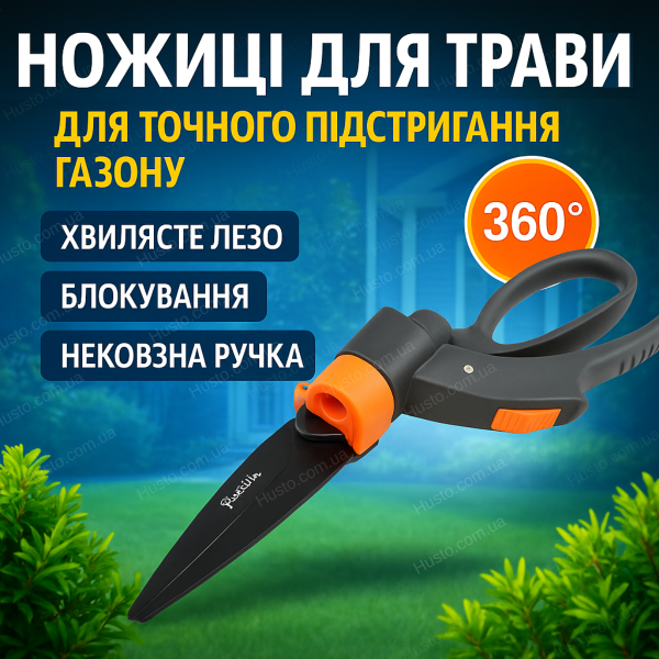 Поворотне на 360° хвилясте лезо з ілафлоновим покриттям забезпечує чистий зріз і стійкість до корозії, а ергономічна нековзна ручка дає повний контроль під будь-яким кутом. Довжина 14 см гарантує точність, а замок фіксує леза для безпечного зберігання — усе, що потрібно для бездоганного газону без зайвих інструментів.