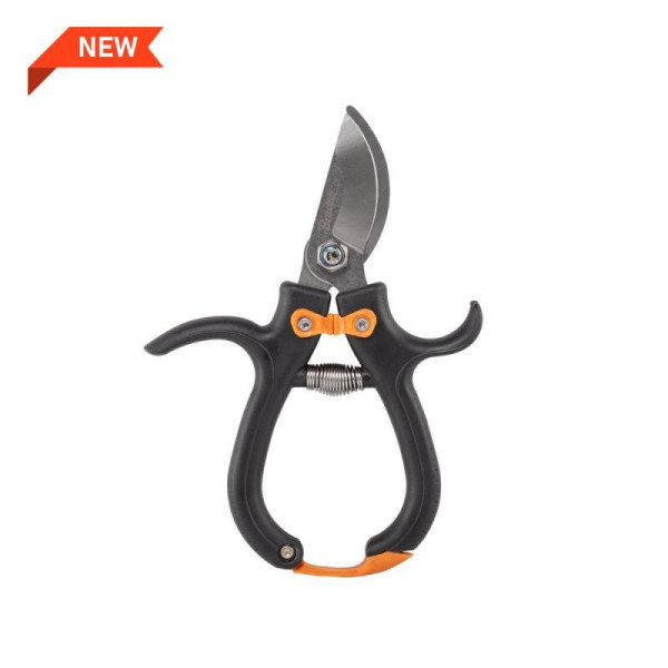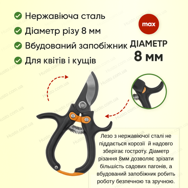 Байпасне лезо з нержавної сталі довго зберігає гостроту та робить чистий зріз, що мінімізує травми рослин; діаметр різання 8 мм підходить для більшості садових робіт; запобіжник захищає леза та користувача під час транспортування й зберігання.