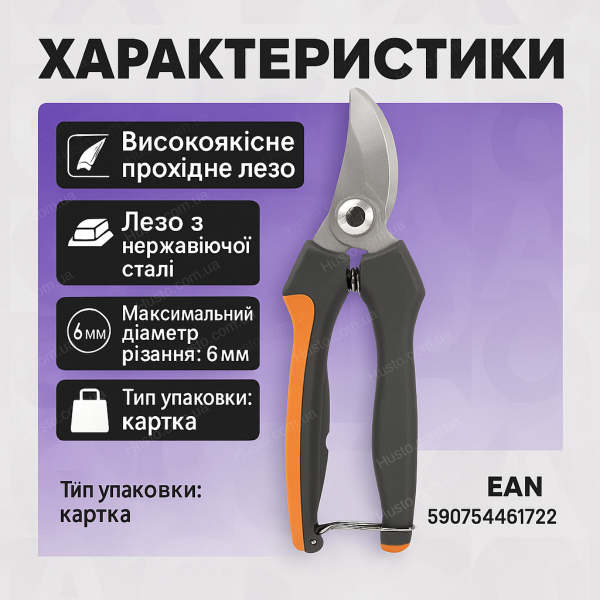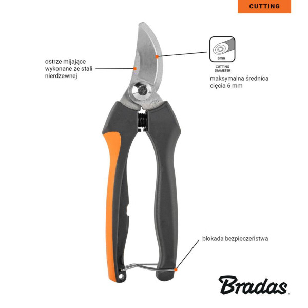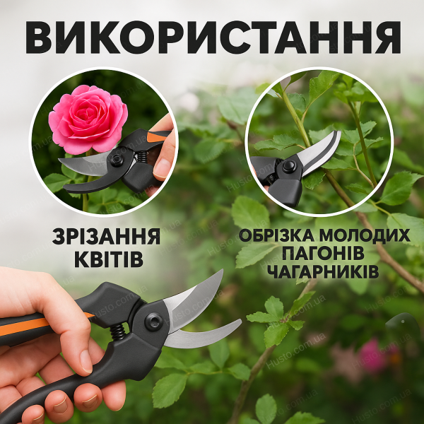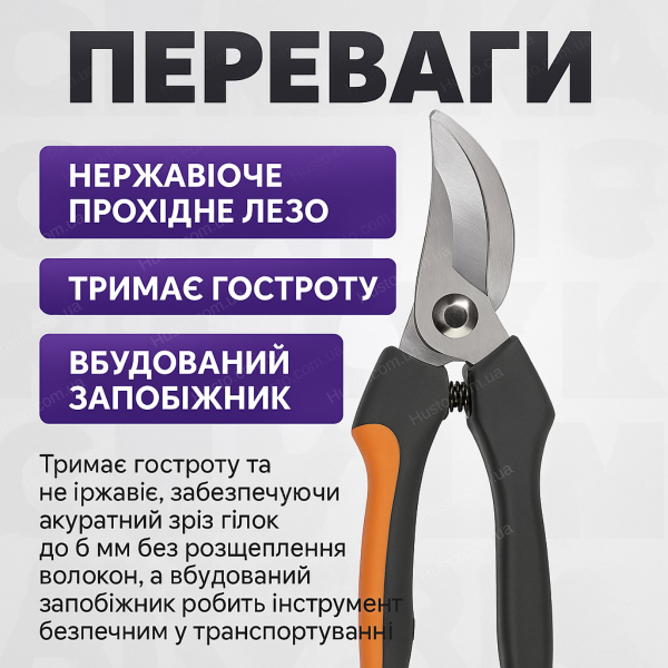 Секатор виготовлено з нержавіючої сталі, що стійка до корозії, обвідне лезо забезпечує чистий рівний зріз без пошкоджень рослини, а вбудований запобіжник робить транспортування і зберігання безпечнішими.