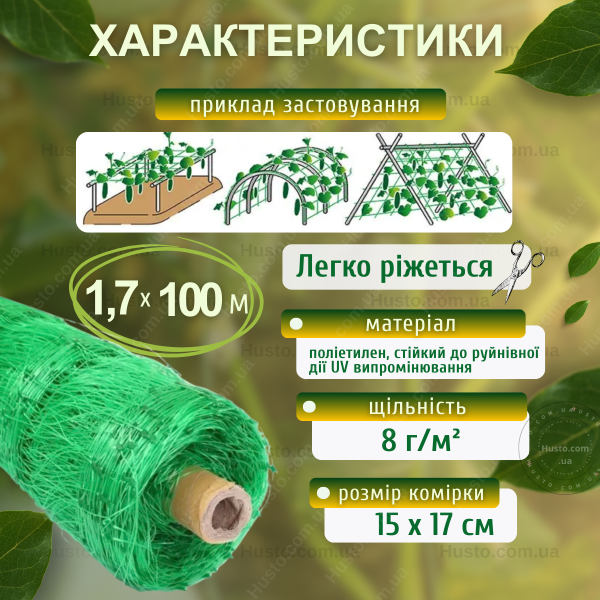 Шпалерна сітка AgroStar (1,7х100м, зелена) — це надійна опора для вирощування огірків, квасолі, гороху, винограду та інших витких культур, яка дозволяє максимально ефективно використовувати площу грядок. Завдяки міцному UV-стійкому поліетилену, великому розміру вічок та довжині 100 м, сітка забезпечує оптимальні умови для росту, спрощує догляд за рослинами та полегшує збирання врожаю.