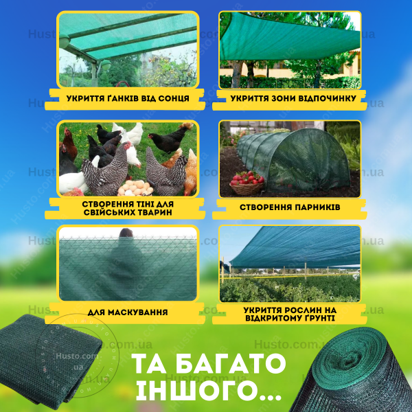 Захист рослин від сонця|Захист рослин від граду|Захист врожаю від птахів|Захист від вітру|Універсальна
