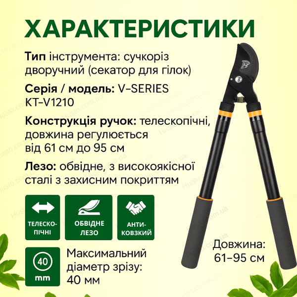 Модель KT-V1210 поєднує довгі телескопічні ручки та зносостійке сталеве лезо, тому одним інструментом ви дістаєтеся до високих гілок, отримуєте чистий різ до 40 мм і працюєте комфортно завдяки нековзним м’яким накладкам.